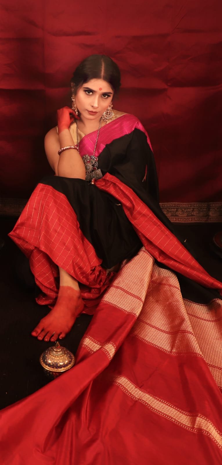 Handwoven rangkat saree in deep Maroon, red, black and fushia pink color. Perfect for festive occasions and grand celebrations. Master piece of craftsmanship.